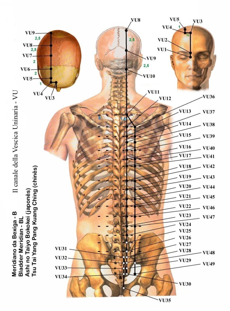 Começa no ângulo medial do olho, no ponto B1, onde emite um ramo interno que vai para o encéfalo e outro para a orelha, onde se comunica com a Vesícula Biliar. Do ponto VG20 segue para a nuca, desce pelo dorso, nádega, coxa até a fossa poplítea, face posterior da perna, margem, lateral do pé, onde termina no leito ungueal do 5º dedo do pé. Um ramo se comunica com o VB20, o outro se separa em dois ramos: um que segue paralelamente à coluna vertebral e, na altura da região lombar, penetra no abdome, comunicando-se com o Rim e se dispersa na Bexiga. Da região lombar, segue para a região sacral, onde se relaciona com o meridiano da Vesícula Biliar nos forames sacros, onde, conjuntamente, penetra a cavidade pélvica na qual envolve a Bexiga. Depois reaparece na região glútea e segue pela face posterior da coxa, indo até a fossa poplítea onde se une com o outro ramo.