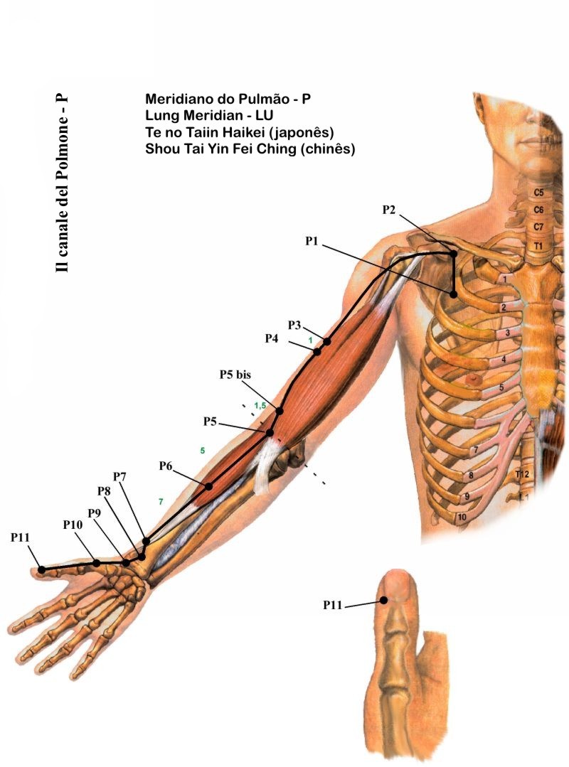 Meridiano Tendinomuscular emerge do polegar, do ponto P11.
