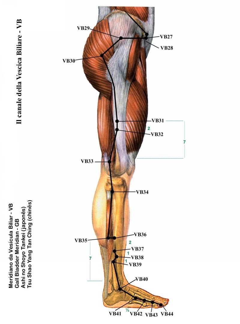 Meridiano Luo Longitudinal e o Transversal: originam-se na perna, no ponto VB37.